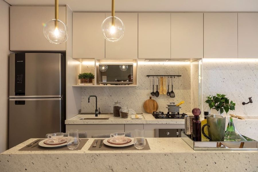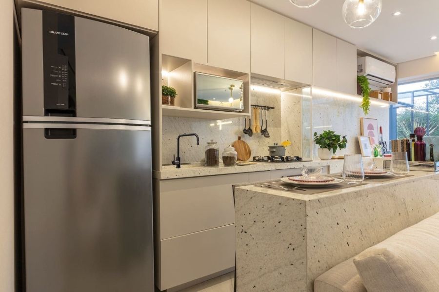 * Cozinha americana, ideal para otimização de espaço e convivência;